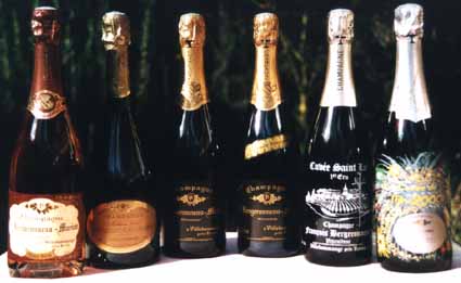 How to drink good Champagne on a tight budgetThis article was written for Living France magazine, and made it into the December 1999 issue by the skin of its teeth under the title Bubbly for the Millennium. Unfortunately it suffered severe cuts in the process, losing over 60% of its length and, I believe, much of its interest. Here is the full text, re-edited. There’s an Englishman who farms in Normandy and has a stall at one of our wonderful local markets every week. Early this summer, having read some of my articles in Living France, he mentioned that a friend of his is a Champagne producer. Maybe I’d like to meet him and write an article about his wines... The following week he gave us a tariff and a bon de commande (order form) from F.Bergeronneau-Marion, propriétaire-récoltant (literally ’harvester’, but meaning ’grower’). The prices were very interesting indeed, with bottles ranging from 73 francs (about £7.70) for basic Brut and Demi-sec to 108 francs (£11.35) for Brut Millesimé 1988 - a vintage Champagne from an excellent year. Given that basic wines from the Grandes Marques (Moët et Chandon, Veuve Clicquot, Mumm and the rest of the 24 houses that have awarded themselves this exalted status) sell for at least £13 in French hypermarkets and well over £20 in Britain, and big-name vintage bubbly commands silly prices, we decided to investigate. ![]() The full range of Bergeronneau Champagnes The bon de commande was printed on a postcard showing what was obviously the producer’s house - delightful, but hardly a château. This suggested a small-scale operation, probably quite traditional, which - along with the prices - could be specially interesting to us and to Living France readers. Preliminary research produced a surprise. Monsieur Bergeronneau’s home village of Villedommange doesn’t even rate an entry in the Guide Michelin, yet The New Sotheby’s Wine Encyclopedia prints a delightful Autumn view of it and lists it as a Premier Cru (first growth) village. This puts it in the top half of the rather complicated pricing structure for Champagne grapes, though not in the top 5% of Grand Cru ones. I phoned from Normandy to arrange an interview. Unfortunately Monsieur Bergeronneau was suffering from acute sciatica and couldn’t speak to me. A week later, he would be delighted to meet us so that we could taste and hopefully buy some Champagne for our Millennium celebrations, but he wasn’t sure he wanted to be the subject of an article. My French isn’t at its best on the phone, and he wouldn’t be the first vigneron to assume that an article by me was going to cost him serious money, so I sent him a carefully-composed fax. When I rang from Beaune the night before our planned visit, he was full of enthusiasm for the idea. Getting thereMy previous visits to Champagne had centred on the great cathedral city of Reims. This time we came through Épernay - an amazing drive past famous Champagne houses, each with its visitor centre from which happy tourists emerged clutching opulently printed carrier-bags full of precious bottles for which they had probably paid ridiculous prices. We took the N51 for Reims and paused for a hurried picnic lunch in the Forêt de la Montagne de Reims - an exciting few minutes trying to eat and drink in a violent thunderstorm while taking turns to hold a metal-shafted umbrella (the perfect lightning-conductor), much to the amusement of the French munching away in their cars. A left turn took us onto the D26 for Sermiers, and we picked our way through the tiny villages of Chamery, Ecueil and Sacy to Villedommange. Every village was full of Champagne producers, but unlike those in Épernay these were small independents. The approach by autoroute from Calais (about two hours on the A26) or Paris (an hour on the A4) is much simpler. The Reims-Tinqueux interchange - Sortie 22 on the A26 - will, with a bit of careful map and sign reading, get you onto the D980. Just after you pass through Pargny-lès-Reims, a left turn takes you straight to Villedommange. There were signs directing us to the Champagne producers in all the villages, and we had no trouble finding the home of Florent Bergeronneau and his wife Véronique, in a pleasant, almost suburban street that ended abruptly in a vast slope of vines. ![]() Some of Monsieur Bergeronneau’s vines They welcomed us warmly. After a brief, courteous bonjour (with the kisses-on-cheeks that all young French children must offer adults, even strangers) from their two children (3½ and 6), we were invited to taste the Brut Grande Réserve (a princely 77 francs or £8.10 a bottle). ![]() What do you say? We have tasted Champagnes we liked a lot, some we liked even more and some we liked quite a lot less, but we have never tasted one we didn’t like at all. The truth is that nobody in their right mind would make bad Champagne - the investment in equipment, effort, expertise, cellar-space and, above all, time (as you will see) is just too great. We liked this one quite a lot. So began over four exhausting but fascinating hours spent trying desperately to keep up with Monsieur Bergeronneau’s machine-gun French. His enthusiasm was not at all impaired by an obviously painful injury, supported by the ceinture (corset) which French doctors seem to give everyone with back problems. The pet projectHe is currently building a salon de dégustation at the bottom of his steep front garden. This will provide a more suitable setting than his rather cramped office for prospective clients to taste his wines. More important, he intends holding half-day initiations - four-hour tutorials in the appreciation of Champagne. These are being run between May and November by a number of vignerons with support from the Chambre d’Agriculture de la Marne and the Épernay tourist office. Visitors will start with directed tastings of things as varied as cinnamon, butter and pineapple - primary education for noses and palates. T